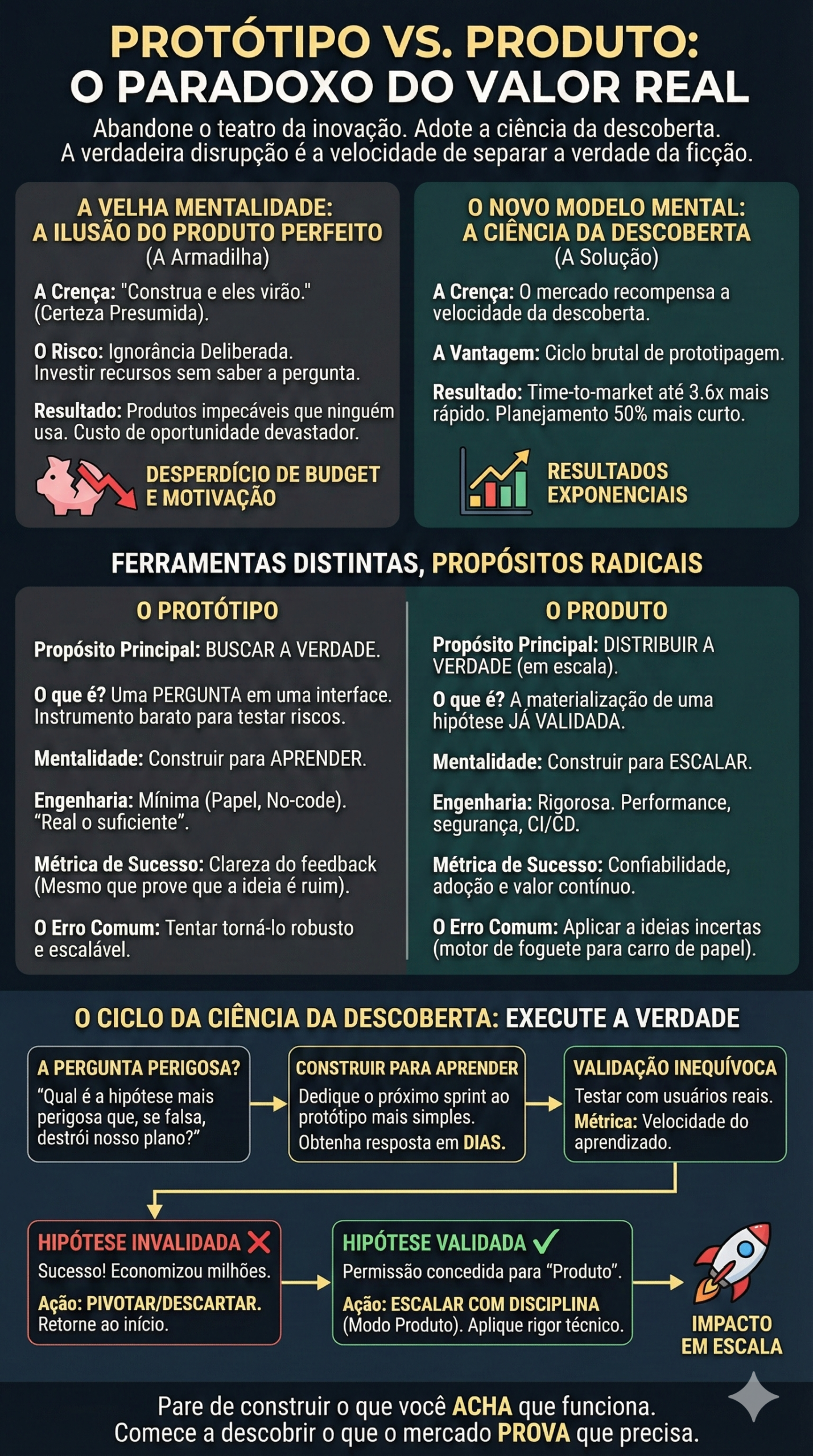 A verdadeira disrupção não está na complexidade do seu código, mas na velocidade com que você separa a verdade da ficção. O debate entre protótipo e produto é, em essência, uma falsa dicotomia. O verdadeiro valor reside na dança entre eles: a coragem de questionar com protótipos e a disciplina de escalar com produtos. Pare de construir o que você acha que funciona. Comece a descobrir o que o mercado prova que precisa.
